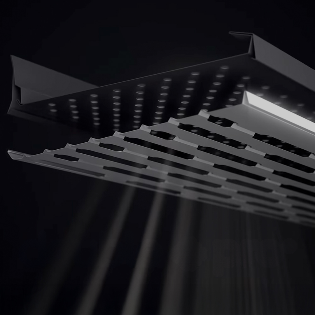 Une combinaison parfaite de membranes en aluminium perforées : la couche inférieure avec de grandes ouvertures oblongues, la couche supérieure avec des micro-perforations décalées avec précision, créant ainsi un filtre parfait.